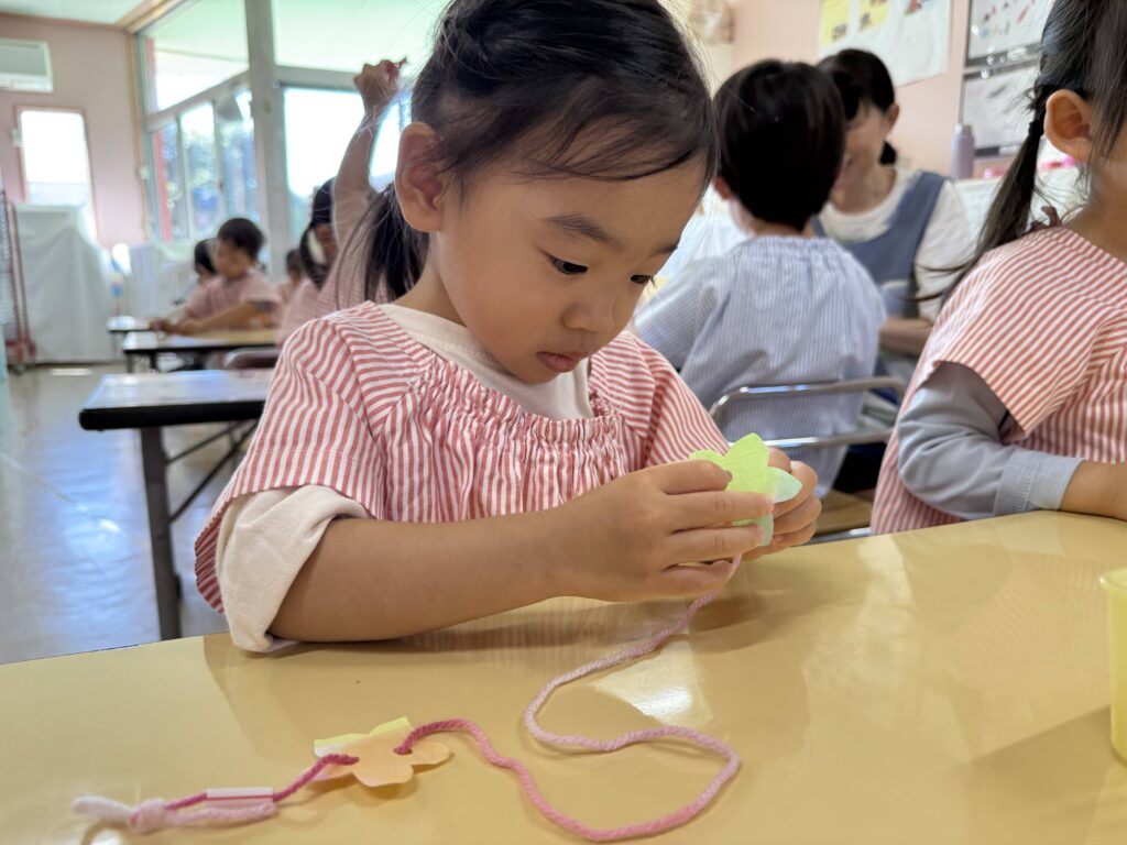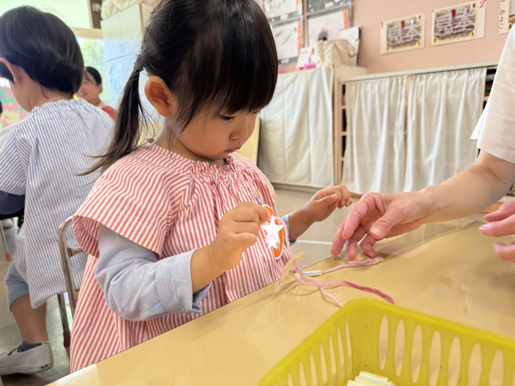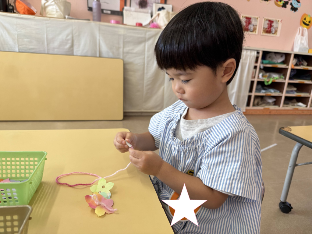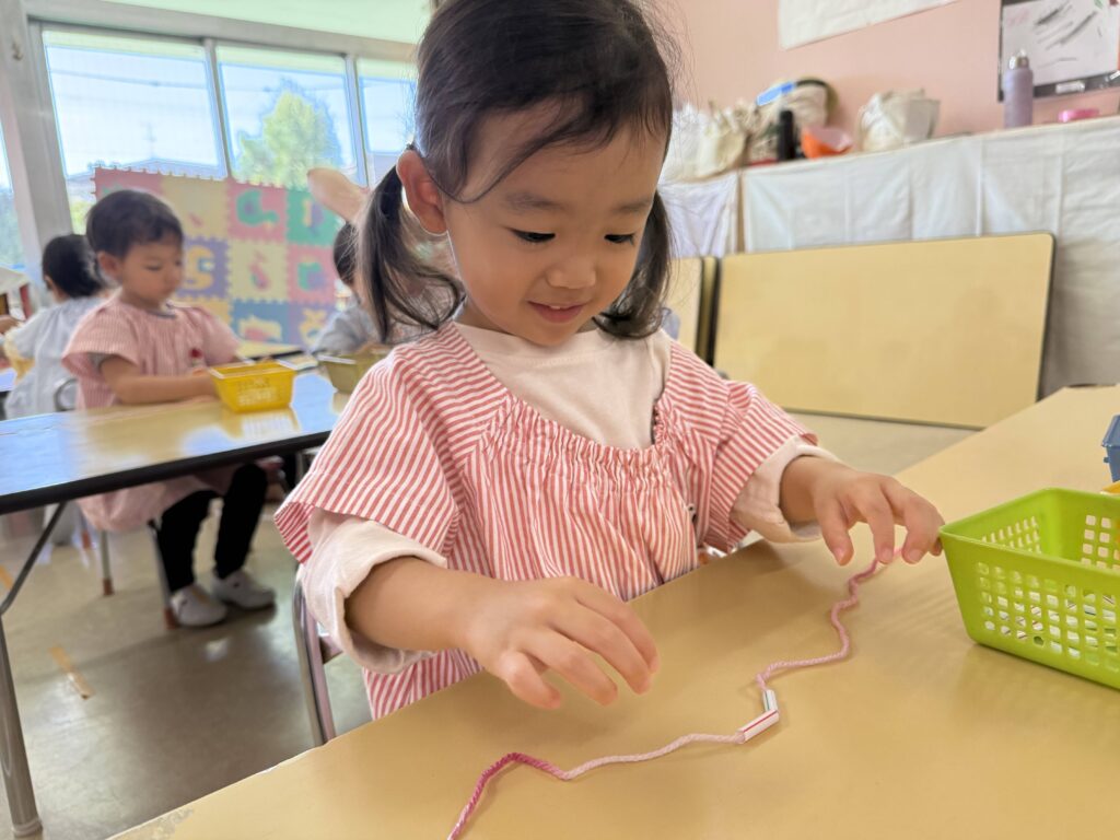 「ここから通すんだよ!」「引っ張るといいんだ!」と、指先を上手に使って、初めてのひも通しにも夢中で取り組みました✨