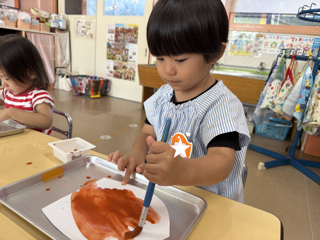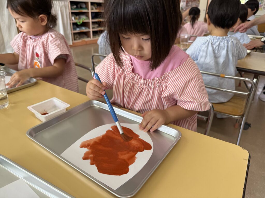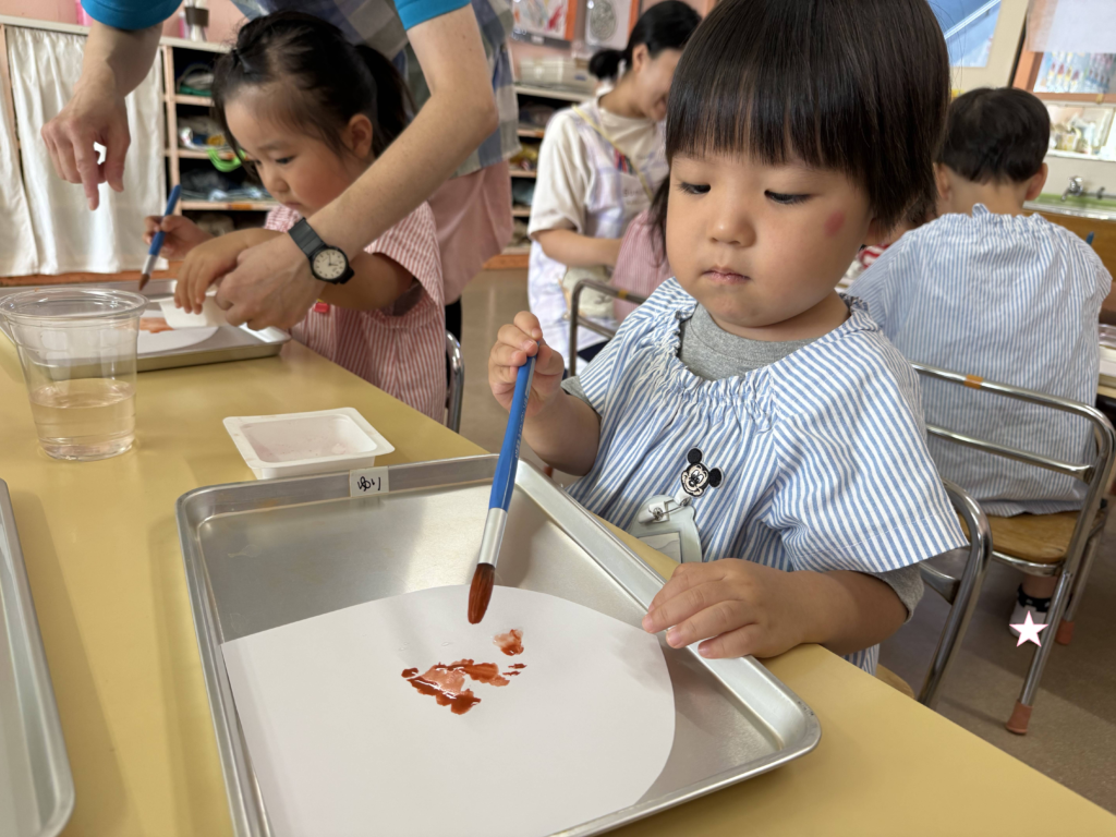 「あれ?筆に絵の具が付かないね」と言う子どもたち。