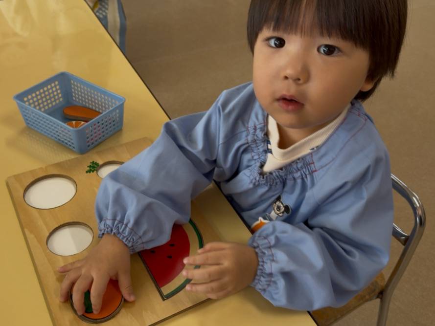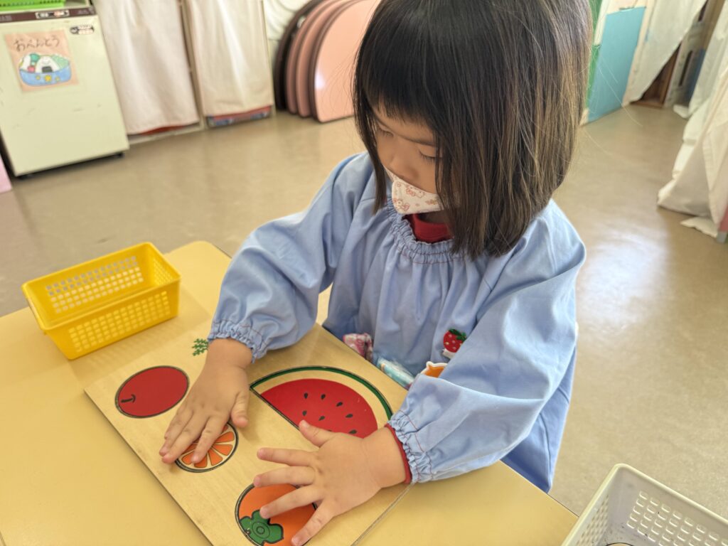 果物の形の特徴をよく見比べながら、ボードに同じ形を探してはめ込んでいくという遊びで、“ものの形の違いや特徴を理解する力を育てられるよう“に、という意図があります。