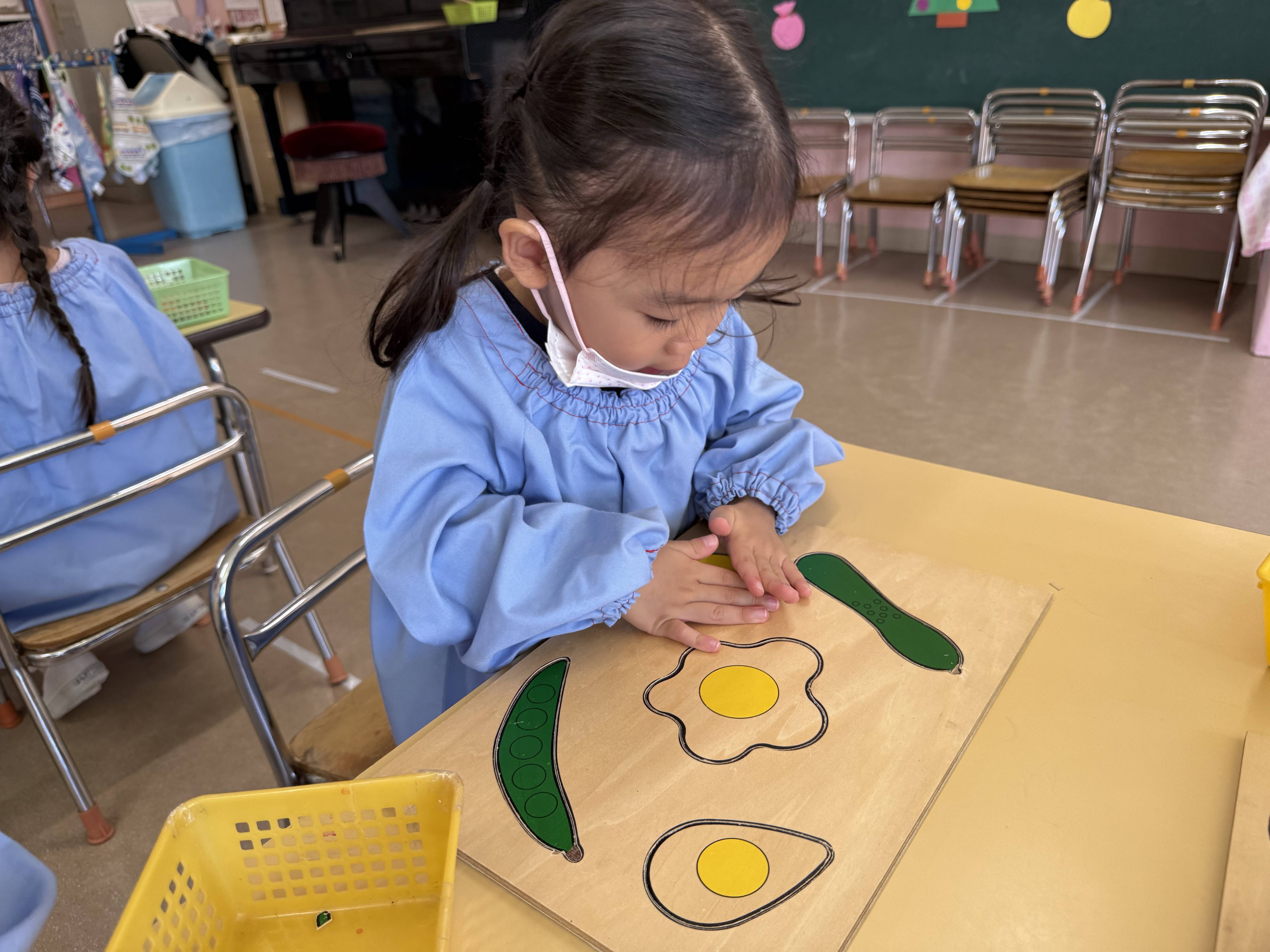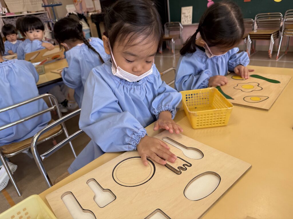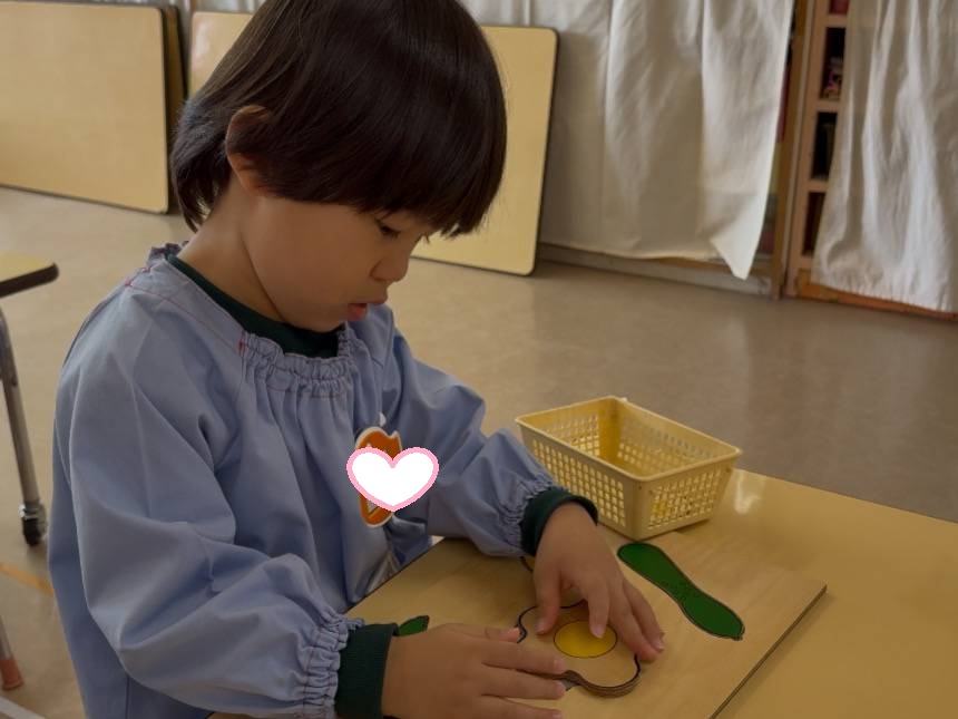 指先で形をなぞったり、角度を変えてはめてみたりしながら、「ここかな?」「あ、はまった!」「あれ〜違うなぁ」とつぶやきながら、一つひとつ丁寧に挑戦する姿がありました🌷