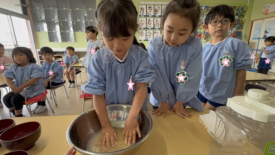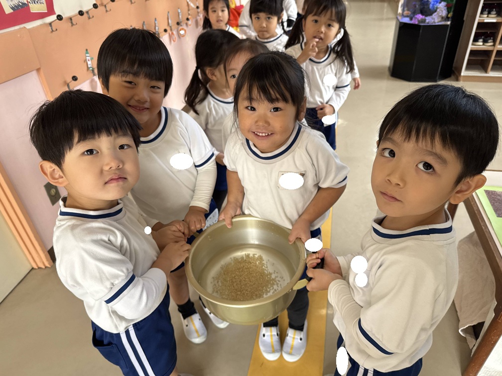 幼稚園で玄米を少し寝かせ、各クラスで洗い、白米と混ぜて炊くことにしました💓