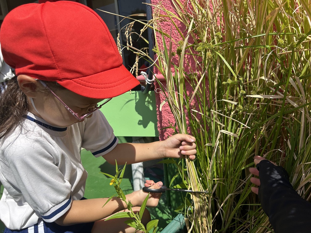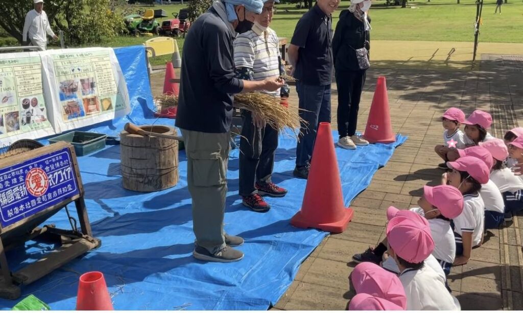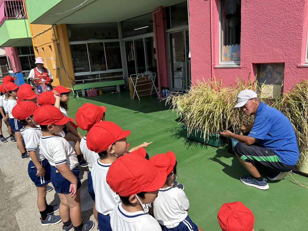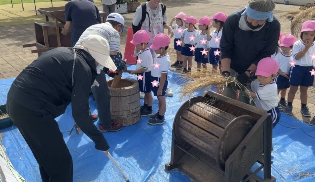 幼稚園の近くにある弁天公園さんにご協力いただき、脱穀をさせてもらえることになり、幼稚園の代表として年少組のみんなに行ってもらいました🎵