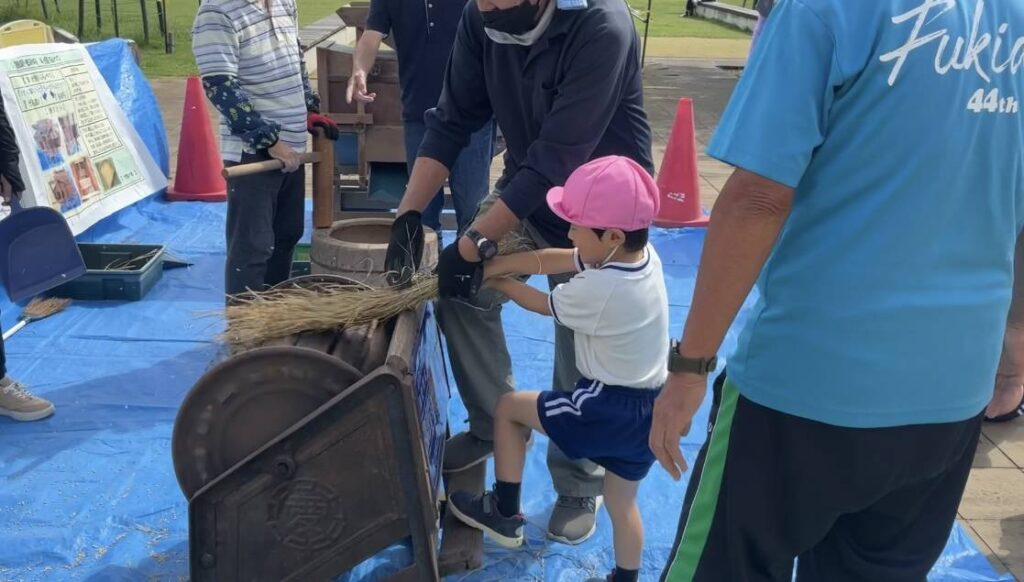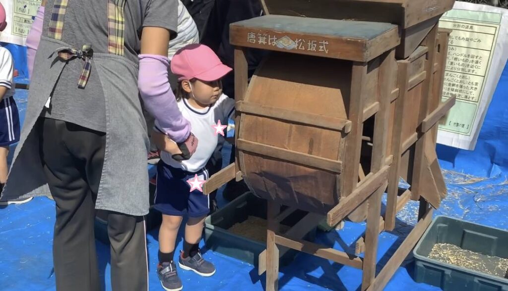 昔ながらの機械を使って稲の穂から「もみ」を外す『脱穀』や、「もみ」から「もみがら」を外す『もみすり』、「玄米」と「もみがら」を分ける『選別』を丁寧に教えていただき、子どもたちも体験させてもらえることに✨