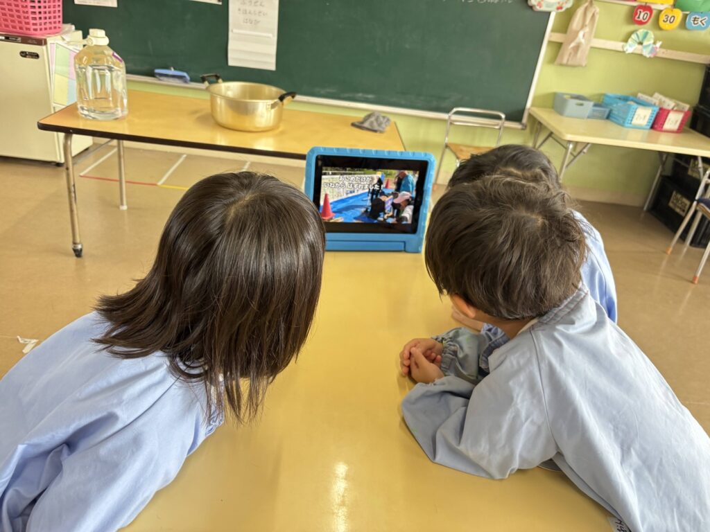 年少組以外のクラスでは、脱穀の様子を動画で見てから・・・
