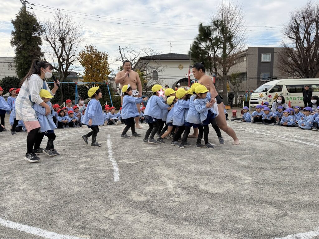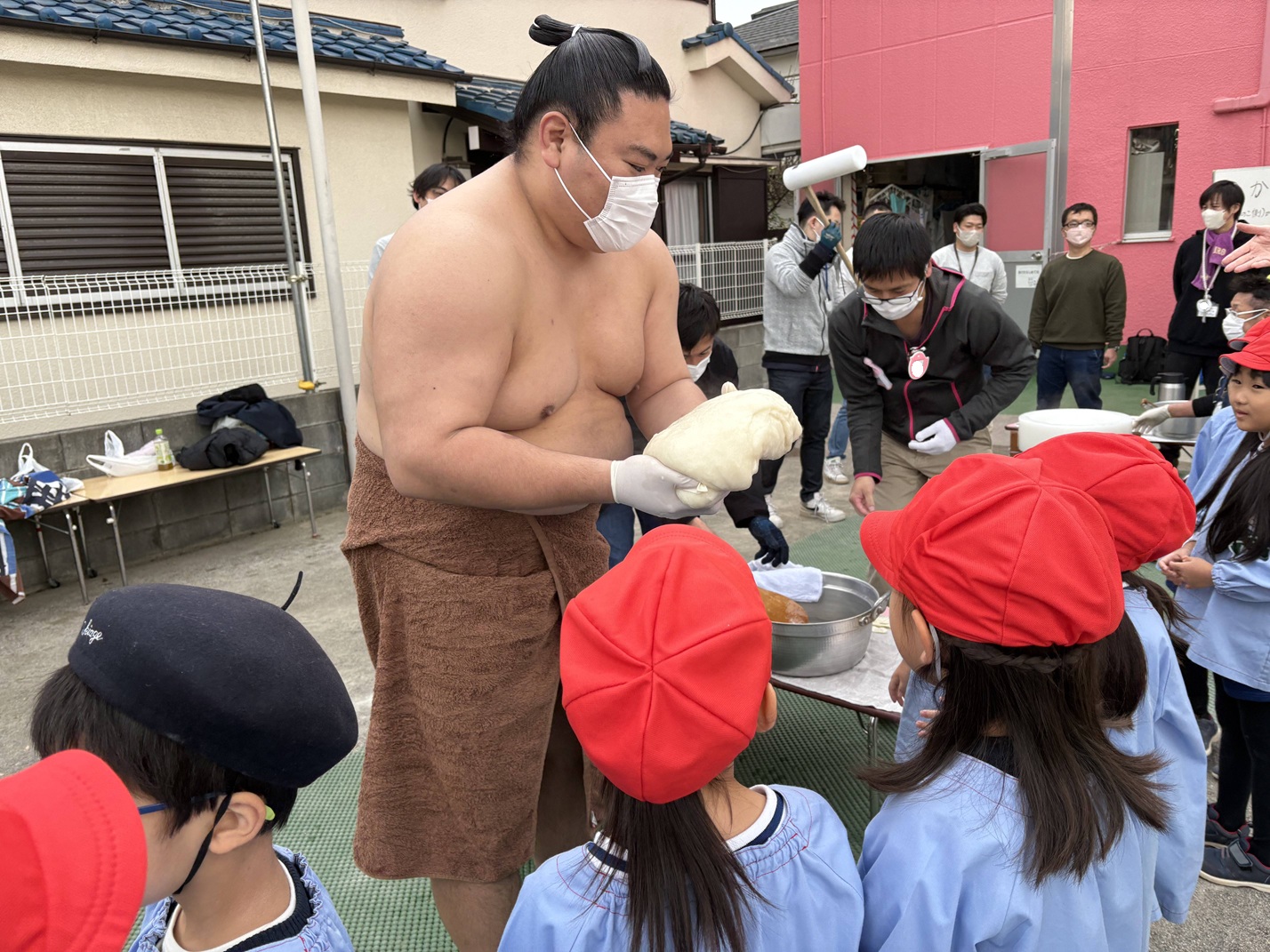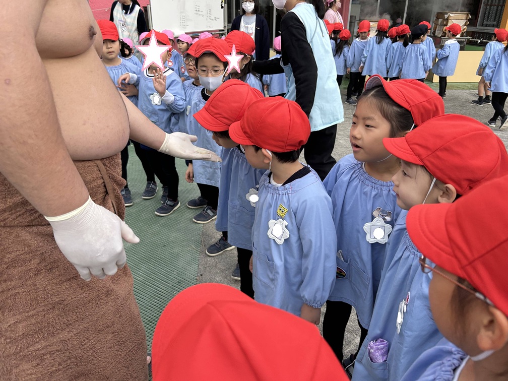 お手伝いに来てくださったお父さんに何のお餅が好きか聞いてみたり、代表のお友達がお相撲さんへの質問したり、お相撲さんの四股や動きを教えてもらい、一緒にやってみたりもしました。