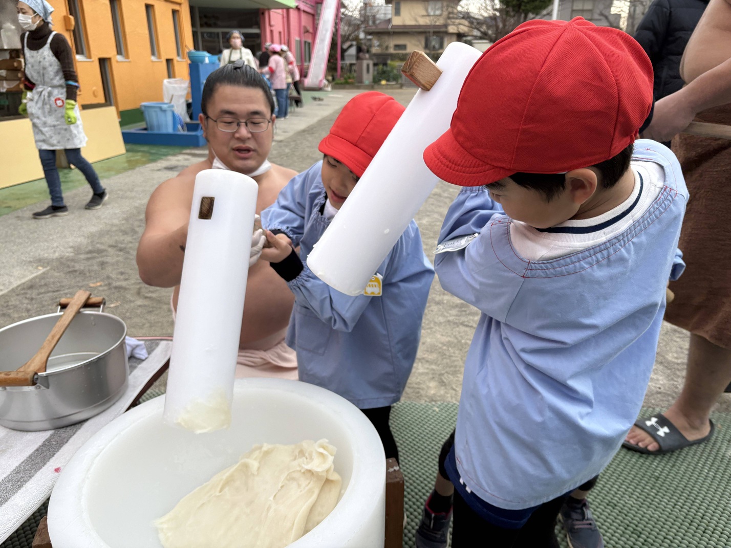 熱々の蒸されたもち米を臼に入れ、杵でつぶしていくのも間近で見て、お相撲さんとお父さんたちが力強く餅をつくところ見て一緒に「よいしょ~」と掛け声も力が入ります。