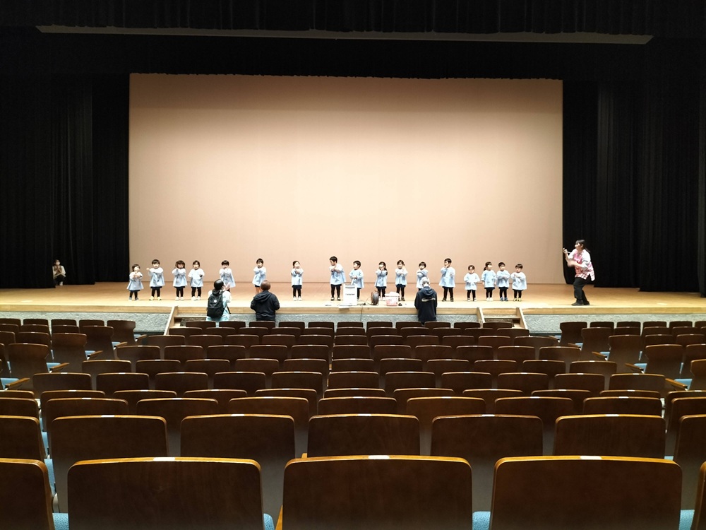 予行は、幼稚園の園庭でお手伝いくださる保護者様と一緒に行う日、発表会を行う浦安市文化会館の大ホールへ行く日の2回行います!