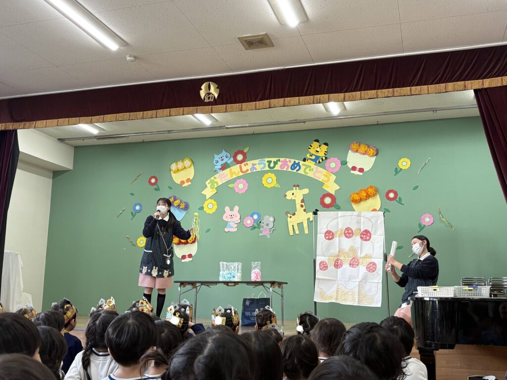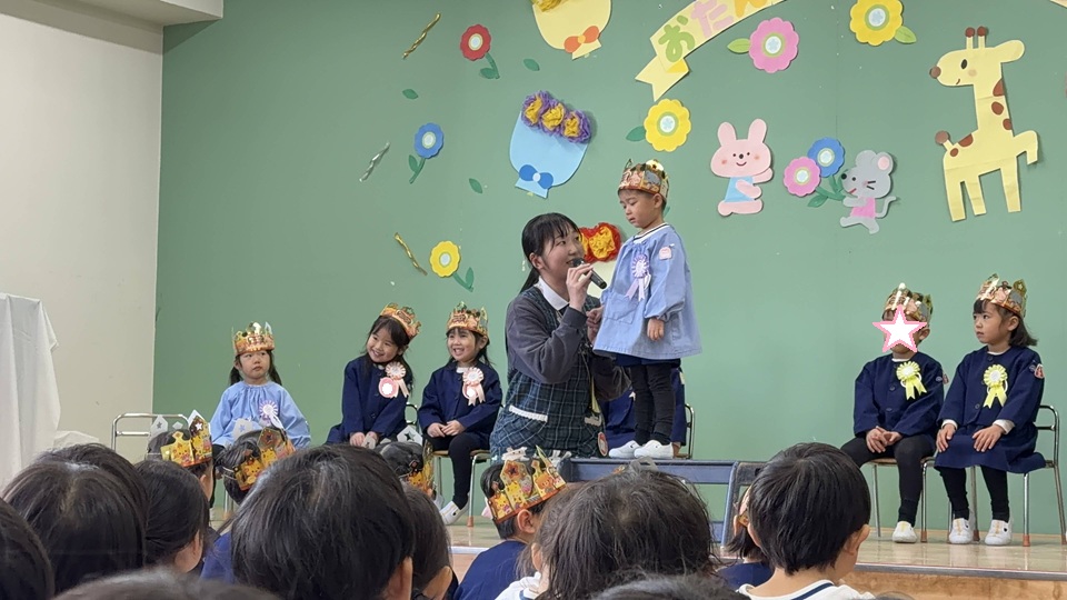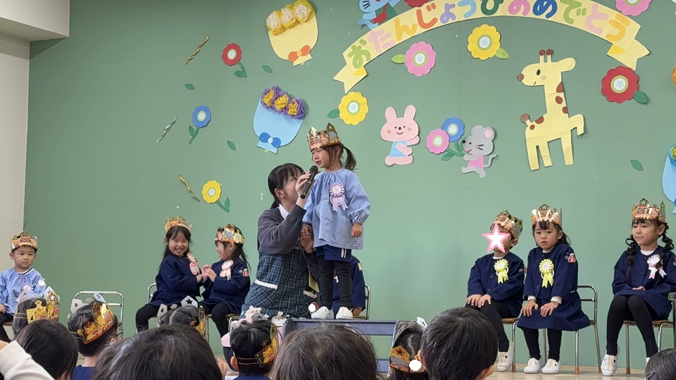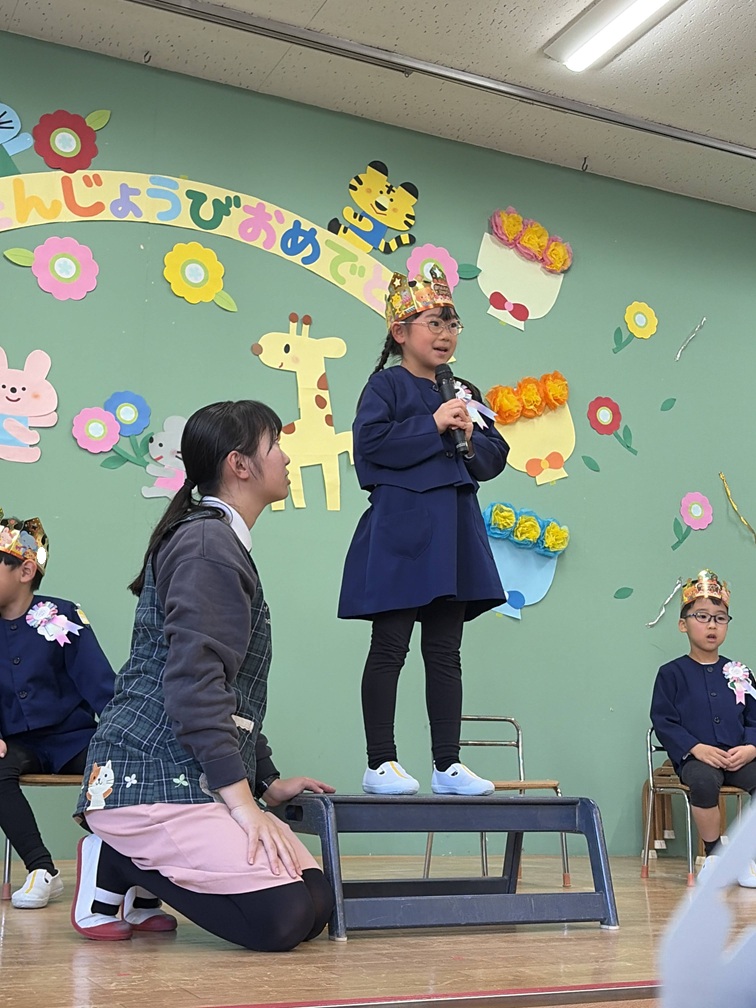 お誕生日のお友だちは舞台の上で、自己紹介や何歳になったか、そして「大きくなったらなりたいもの」を発表🎤