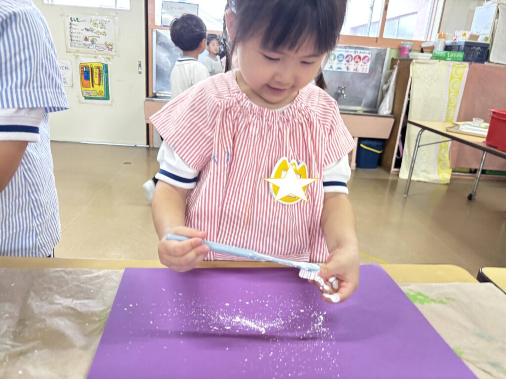 白い絵の具を歯ブラシにつけて散らすと細かい模様が出ました!