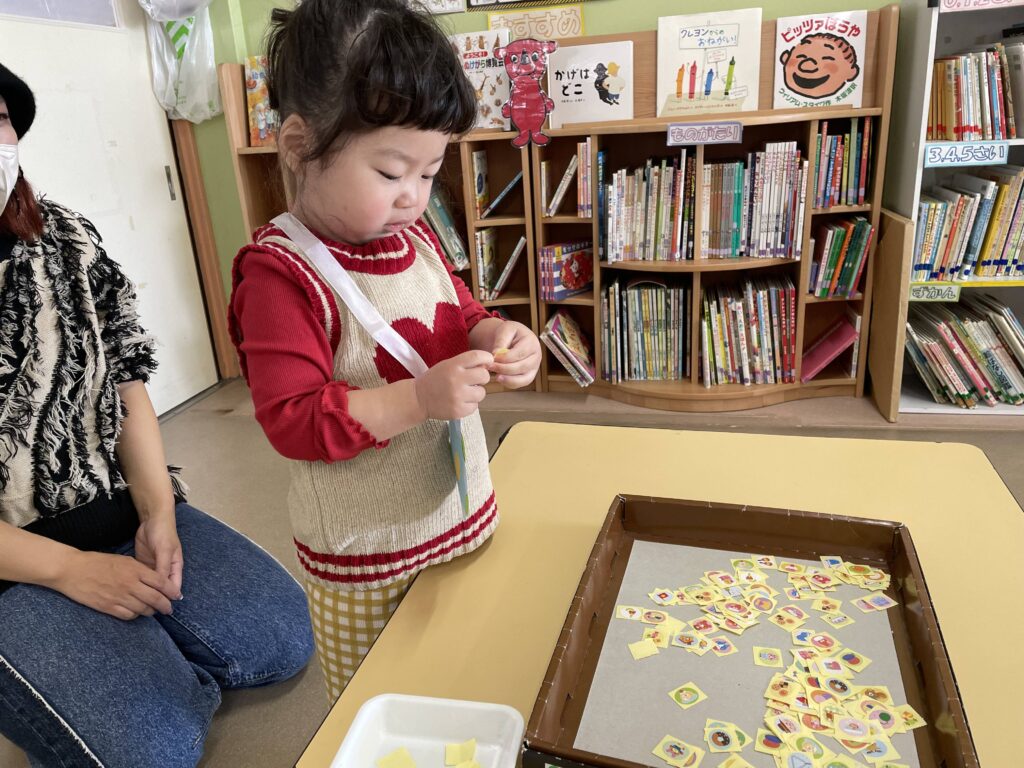 幼稚園のお友だちが毎朝おたより帳に貼っているシール貼り体験をしたり、