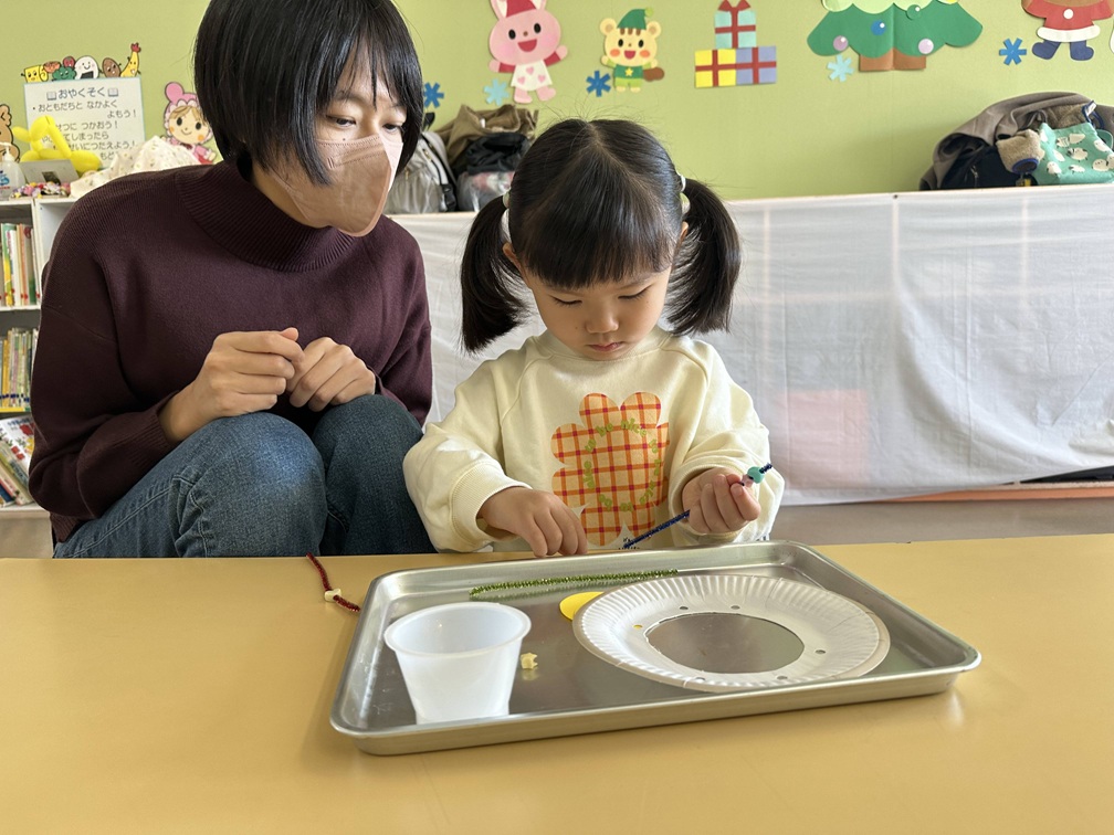 子どもたちはモールにビーズと鈴を通し、お母さんに紙皿にモールを通してもらって、ジングルに見立てた丸い画用紙を好きな場所に貼って完成♪