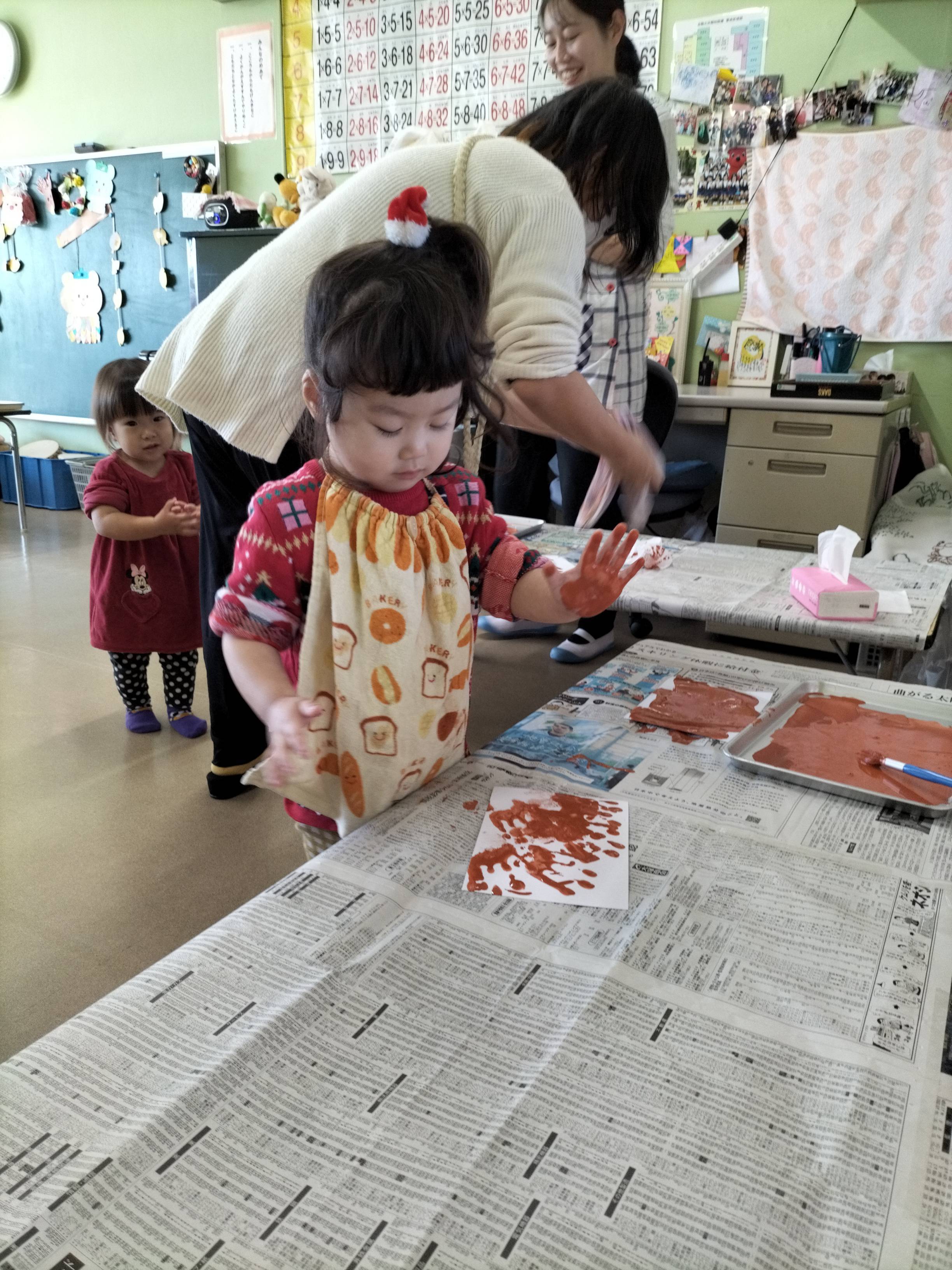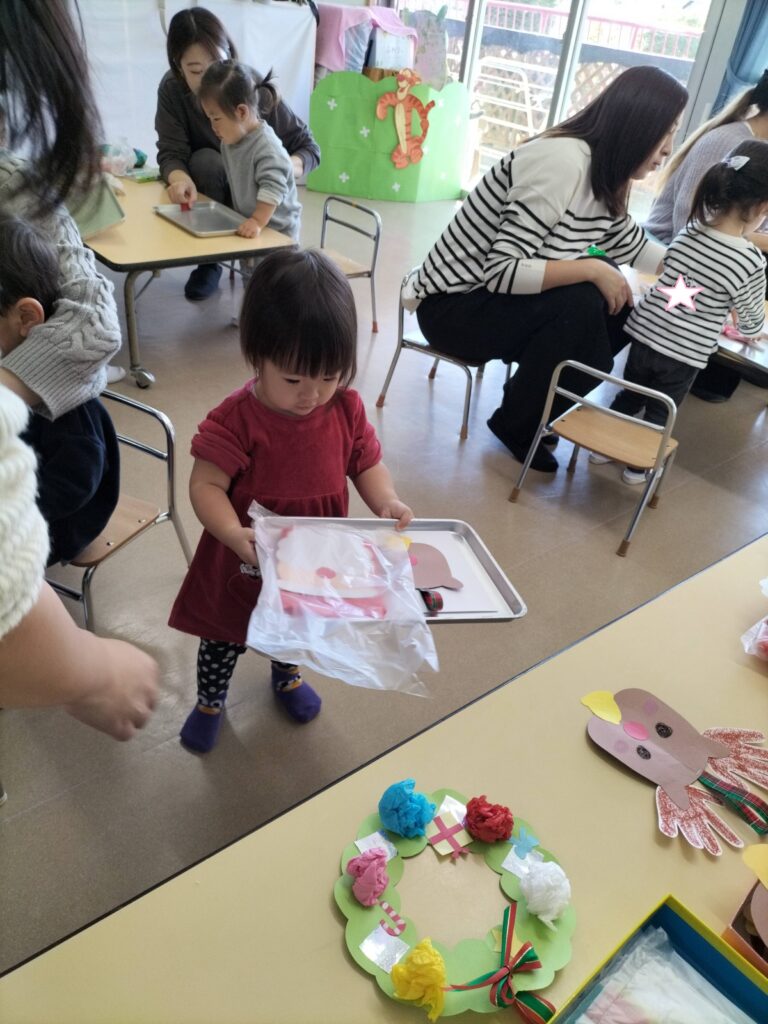 昨日は今年最後の親子教室!1歳児うさぎ組の開催でした。8組の親子さんが申込みしてくださり、お部屋ではクリスマスソングを流して、わくわく気分で皆のことを待っていました🎅♪