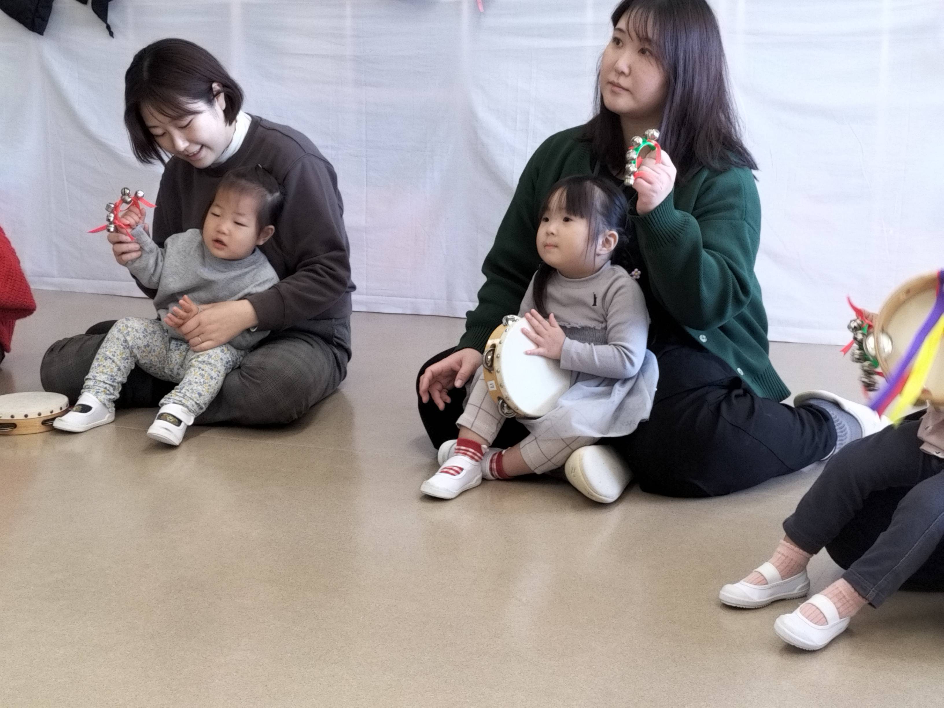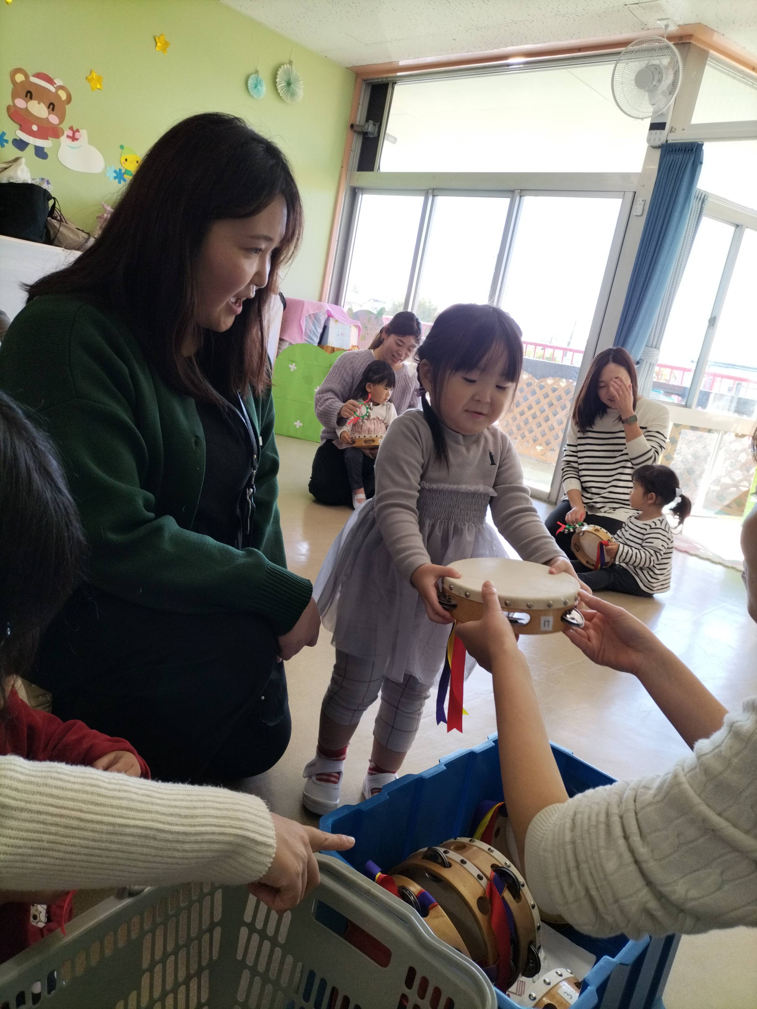 室内遊びを楽しんだあとは鈴・タンバリンを選んでお歌に合わせて自由に音を奏でました♪