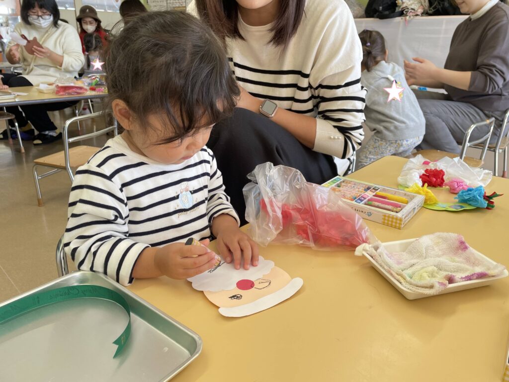 楽器あそびのあとは今日のテーマでもある「クリスマス飾り作り🎄」!!皆が喜んでくれるといいな~と気持ちを込めて、サンタクロース・トナカイ・リースの3つの制作を準備しました💓もちろん、3つ全部チャレンジしても良し、お子様の「やりたい!」という気持ちに合わせて集中力を見ながら1~2つにしても良し、一人ひとりのペースに合わせて楽しんでいただけます✨材料を選びにお買い物~♪しっかり指を指してどれを作りたいか教えてくれ、「これがやりたい!」と気持ちが伝わってきました!子どもたちの気持ちを大切にキャッチできるように、制作では“選ぶ要素”をたくさん取り入れるようにしています♪