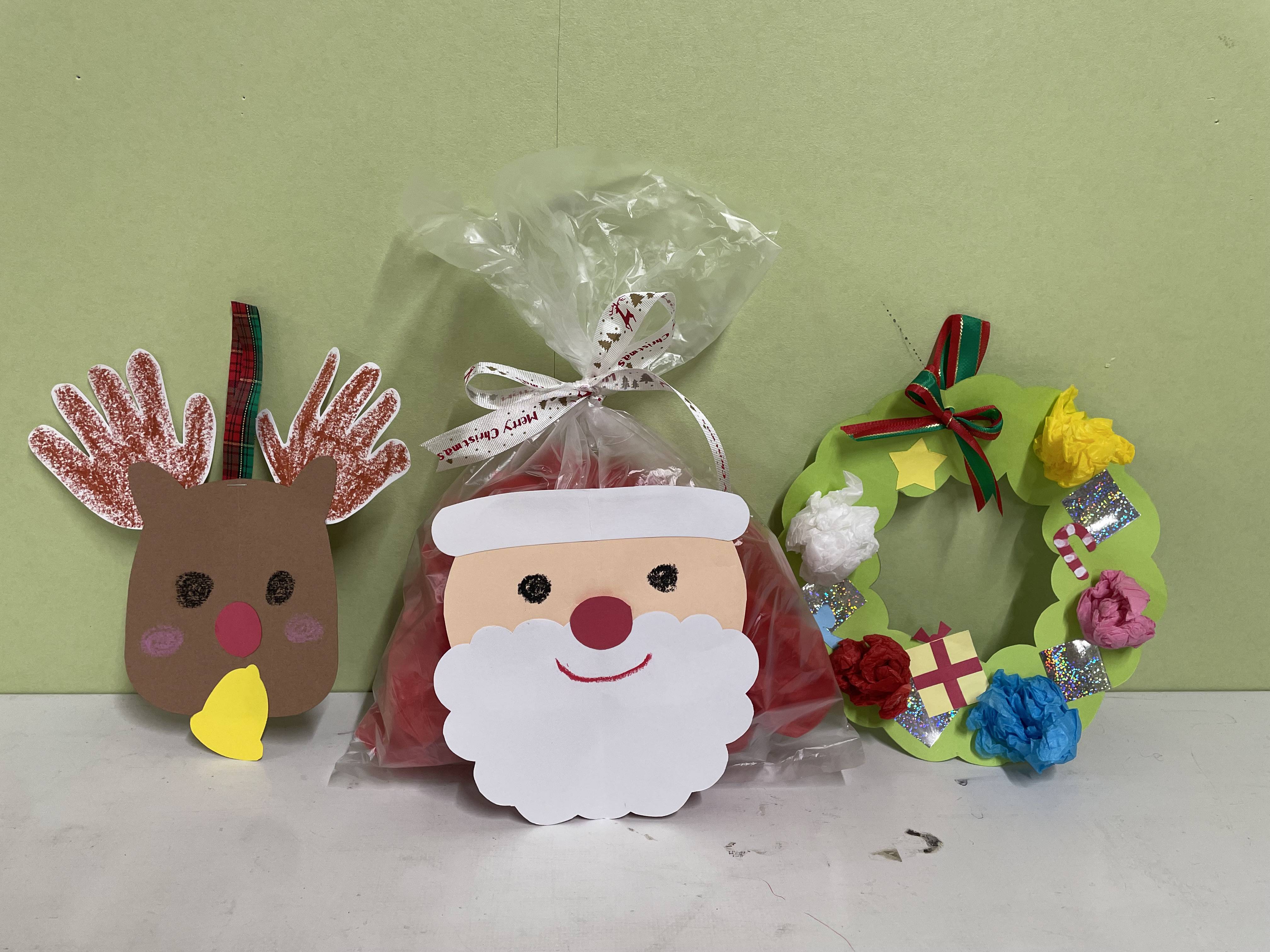 花紙をくしゅくしゅと丸める、お顔を描く、のりで貼る、はさみを使う、絵の具で手形ぺったん…様々な制作手順がありましたね✨ぜひお家に飾ってクリスマス気分を味わっていただけたら嬉しいです🎅💓