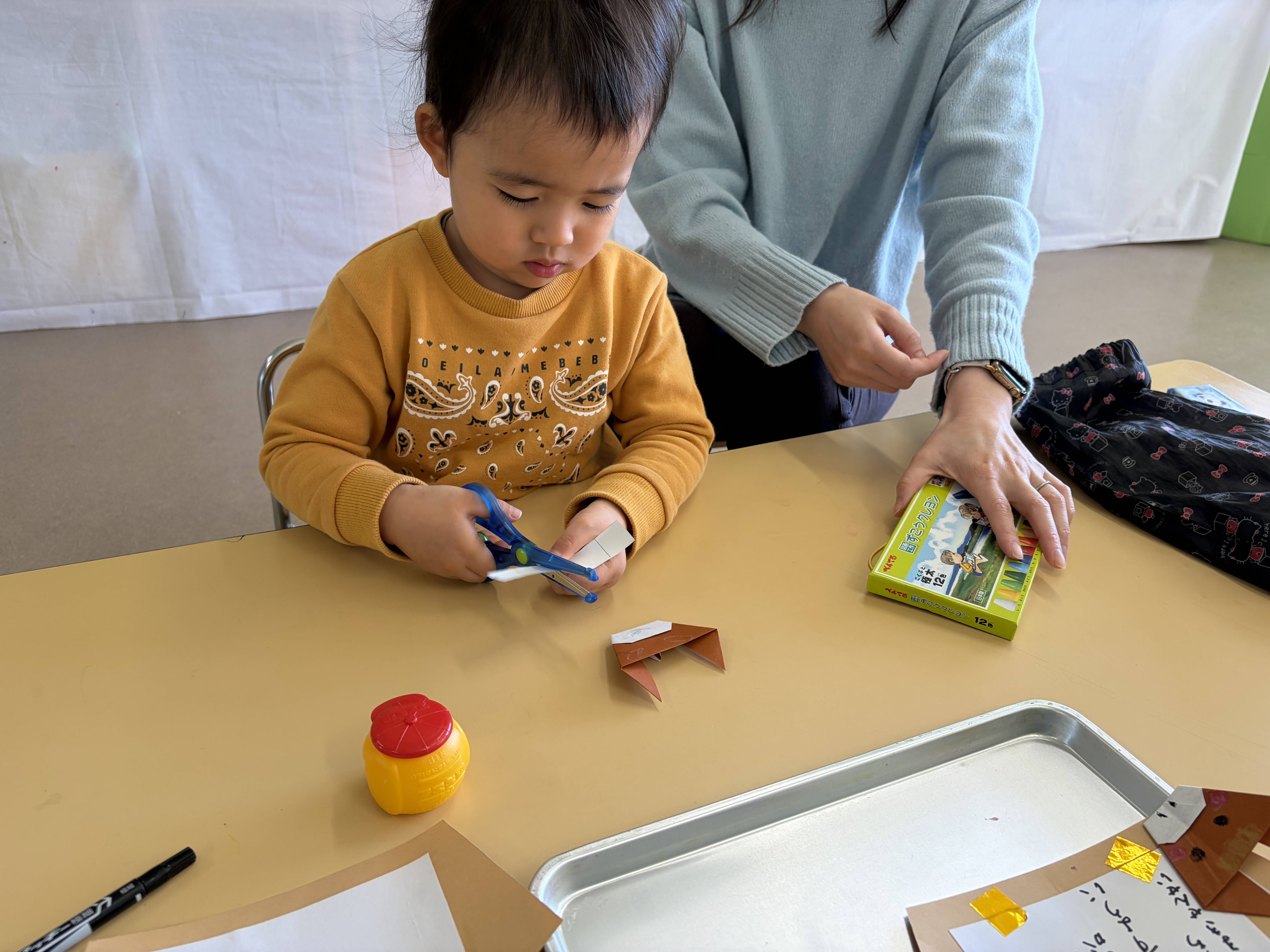羽子板あそびのあとは絵馬作り✨干支に因んだ絵本を読んだあとに、折り紙の馬がモチーフの絵馬を作りました🐴人差し指(1の指と呼んでいます♪)で折り目をしっかりアイロン掛けしてくれました!