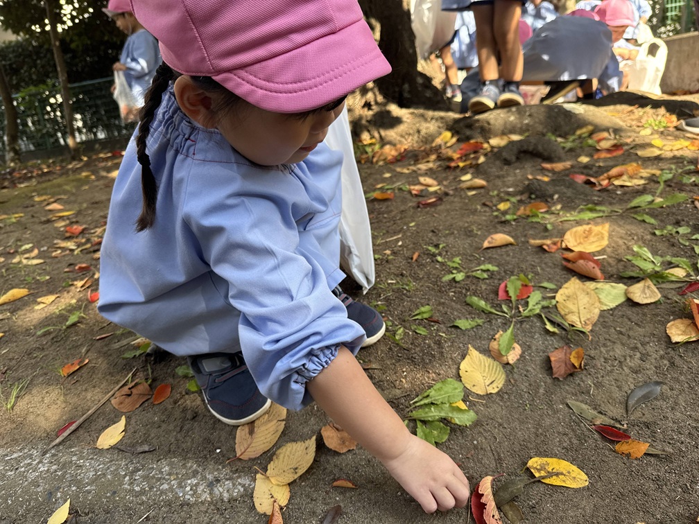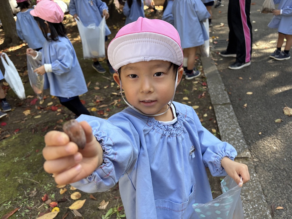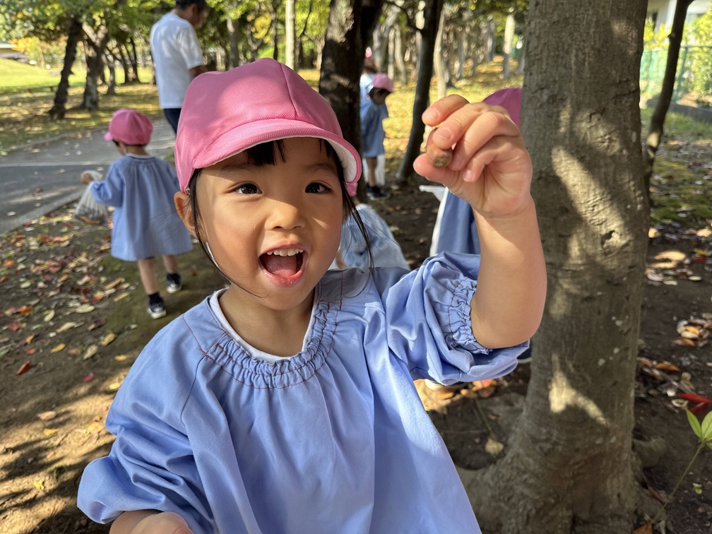 落ち葉やどんぐりを見つけて「見て見て!こんなのあったよ!」と夢中になって拾う姿があちらこちらに見られました。小さな手の中には、秋の“宝物”がたくさん。季節を感じながら自然と触れ合う、心あたたまる時間となりました🍁