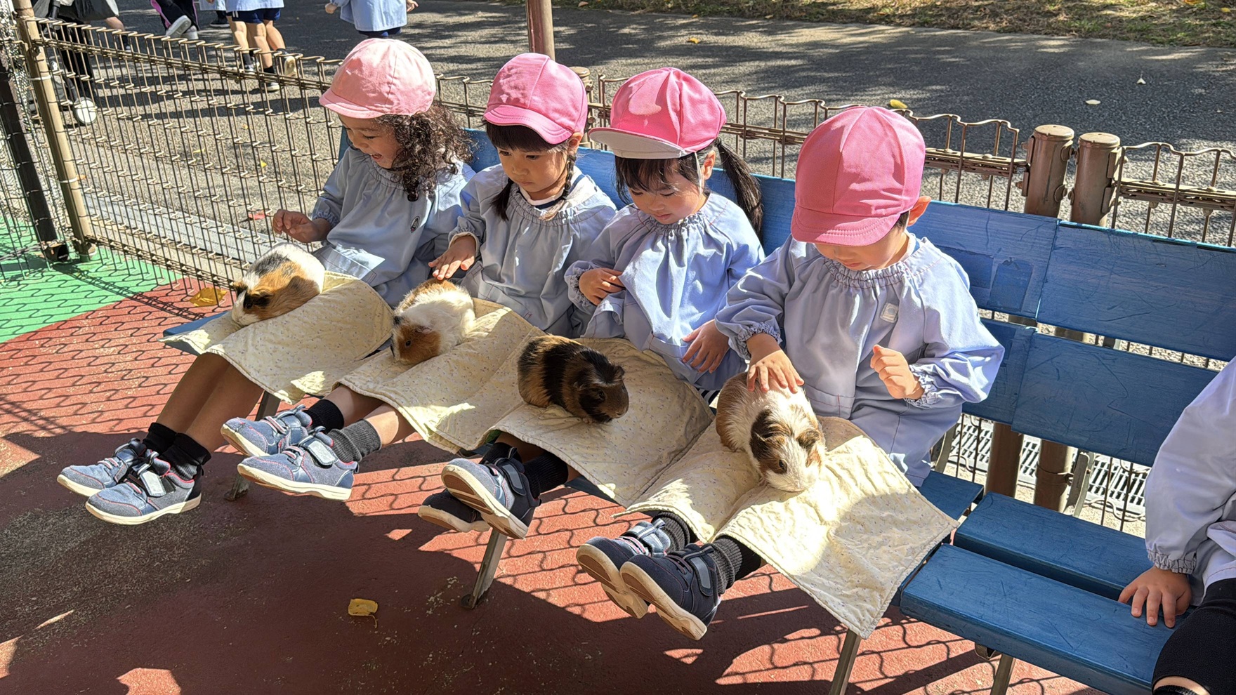 モルモットを抱っこさせてもらうと、「ふわふわ~!」「あったかいね」と笑顔がこぼれ、先生たちもほっこり♡