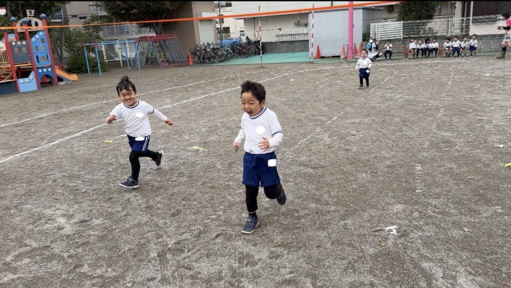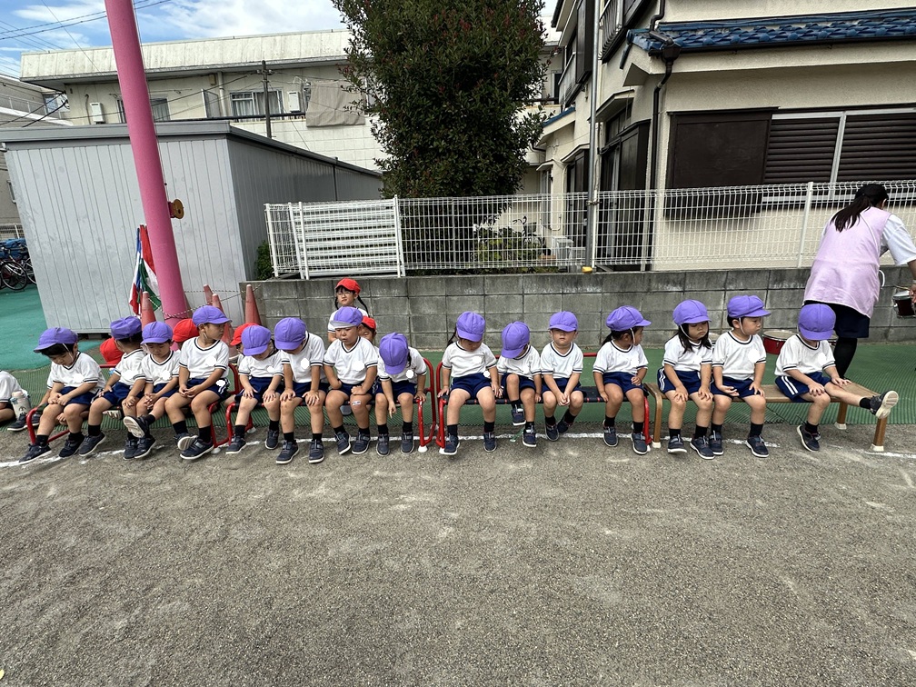 ベンチに座り、名前が呼ばれたお友達は「よーいどん」で走ります!