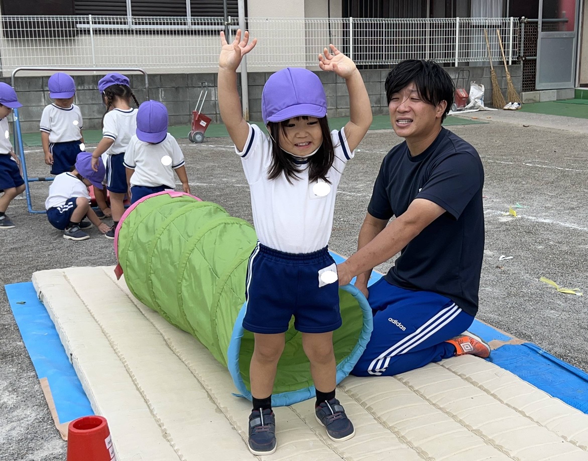 ベンチに座り、名前が呼ばれたお友達は「よーいどん」で走ります!