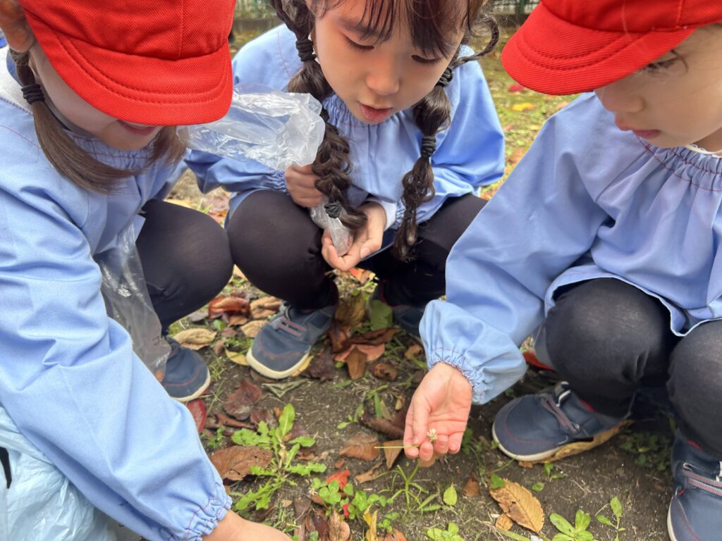 秋の図鑑を持って行った子は図鑑を見ながら「こんな形のどんぐり見つけたよ!」「葉っぱが赤くなってる!」と、友だちと顔を見合わせ、発見を喜ぶ姿が見られました。