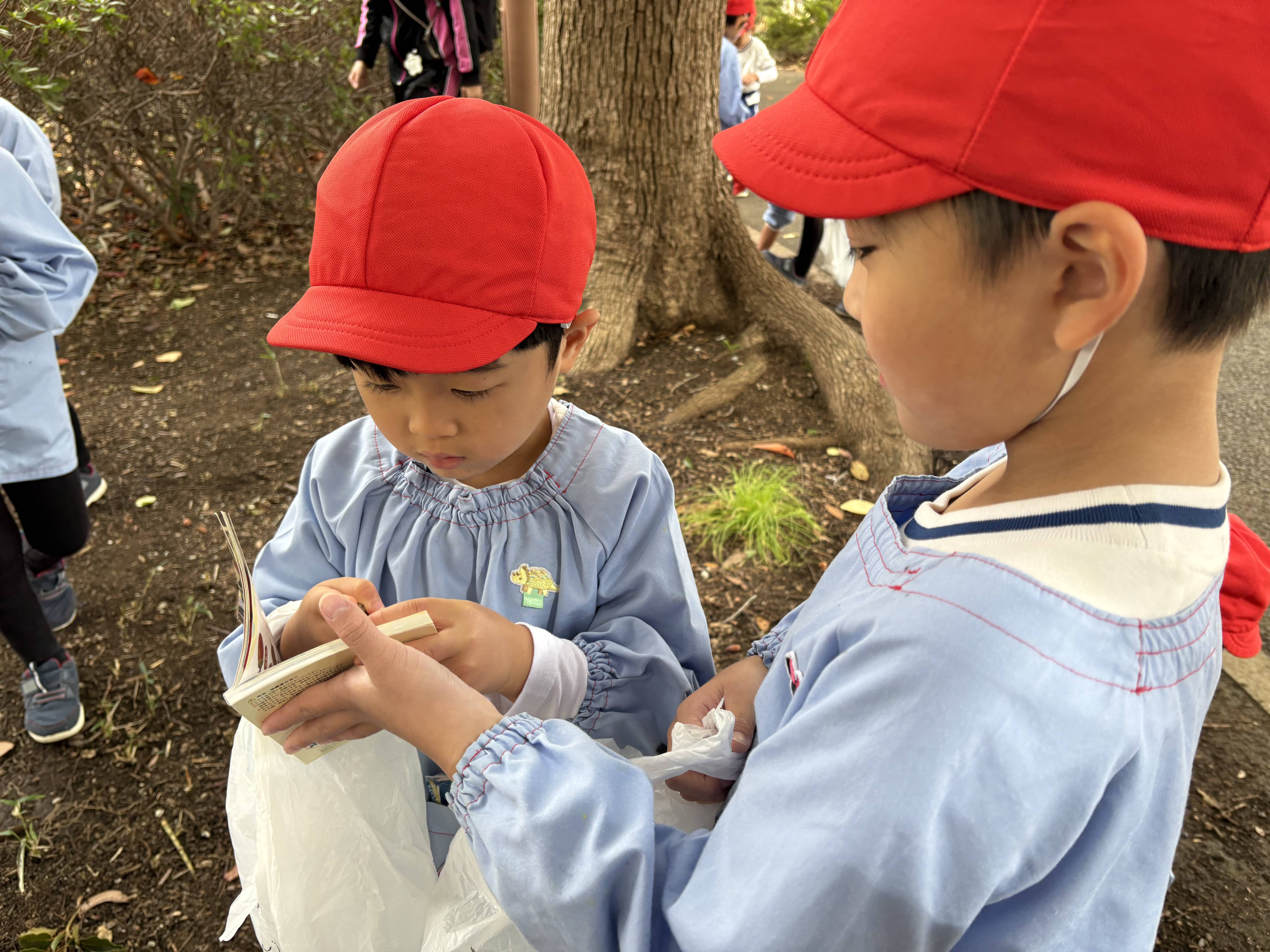 秋の図鑑を持って行った子は図鑑を見ながら「こんな形のどんぐり見つけたよ!」「葉っぱが赤くなってる!」と、友だちと顔を見合わせ、発見を喜ぶ姿が見られました。