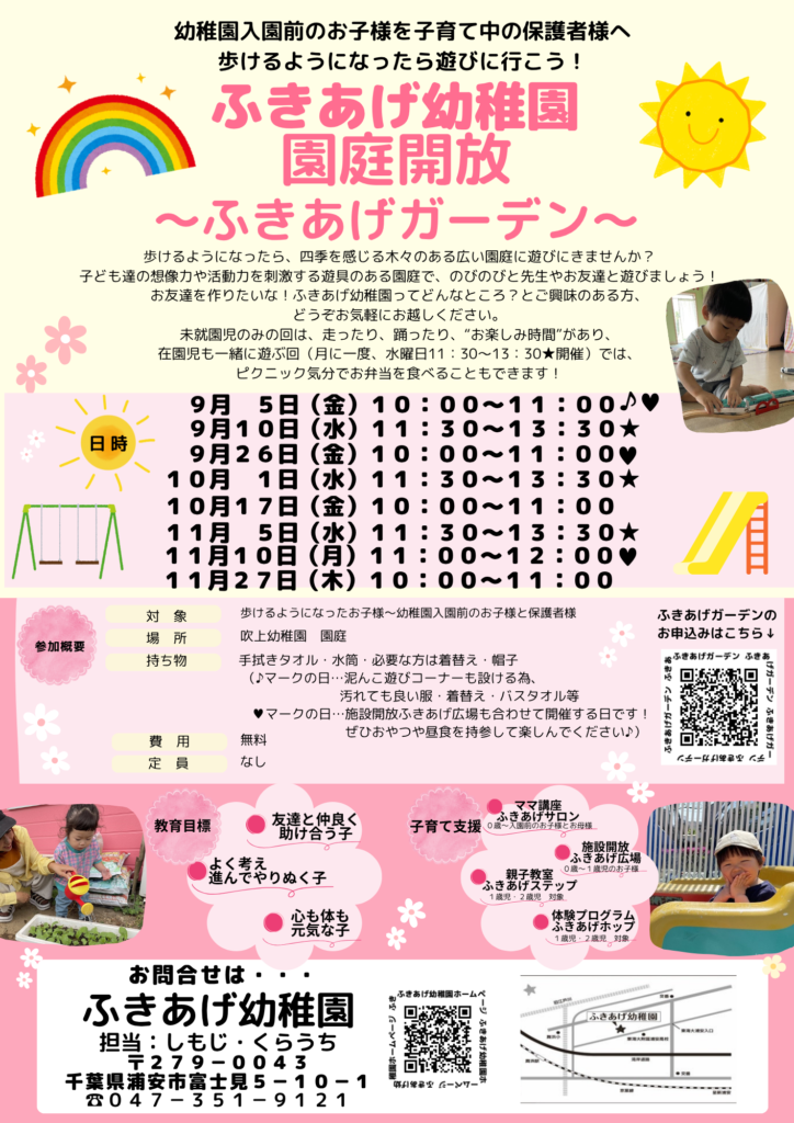 ふきあげようちえんアプリご利用の方は、アプリ参加予約からワンクリックでご予約も可能です♪ぜひご利用ください!♪マークの日は泥んこ遊びコーナーも設ける為、持ち物の確認をお願いします。♥マークの日は施設開放ふきあげ広場も合わせて開催する日です!ぜひおやつや昼食を持参して楽しんでください。