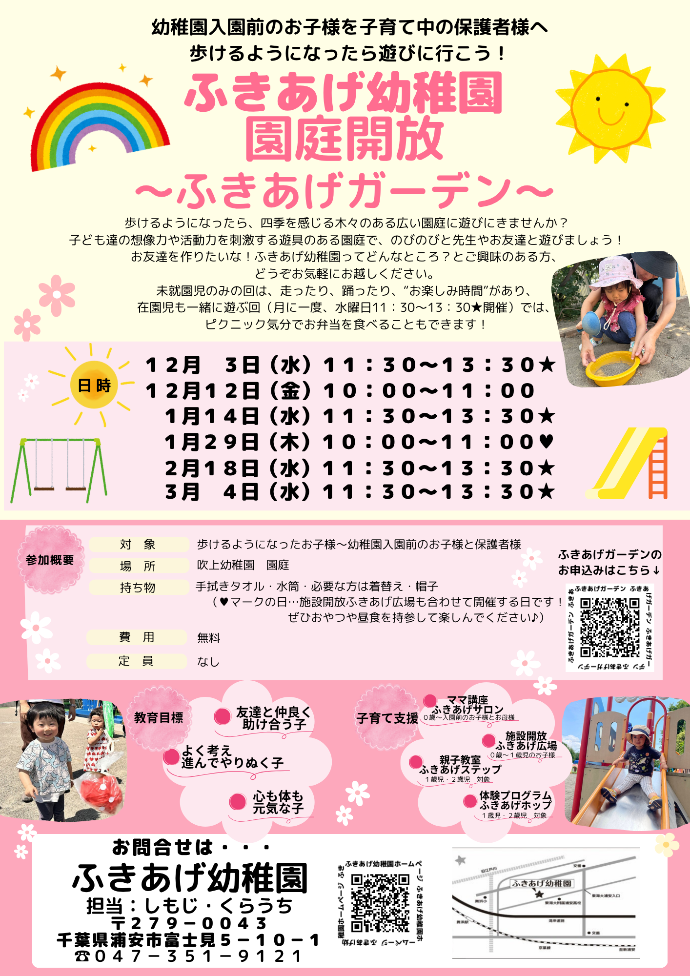 ♥マークの日は施設開放ふきあげ広場も合わせて開催する日です!ぜひおやつや昼食を持参して楽しんでください。